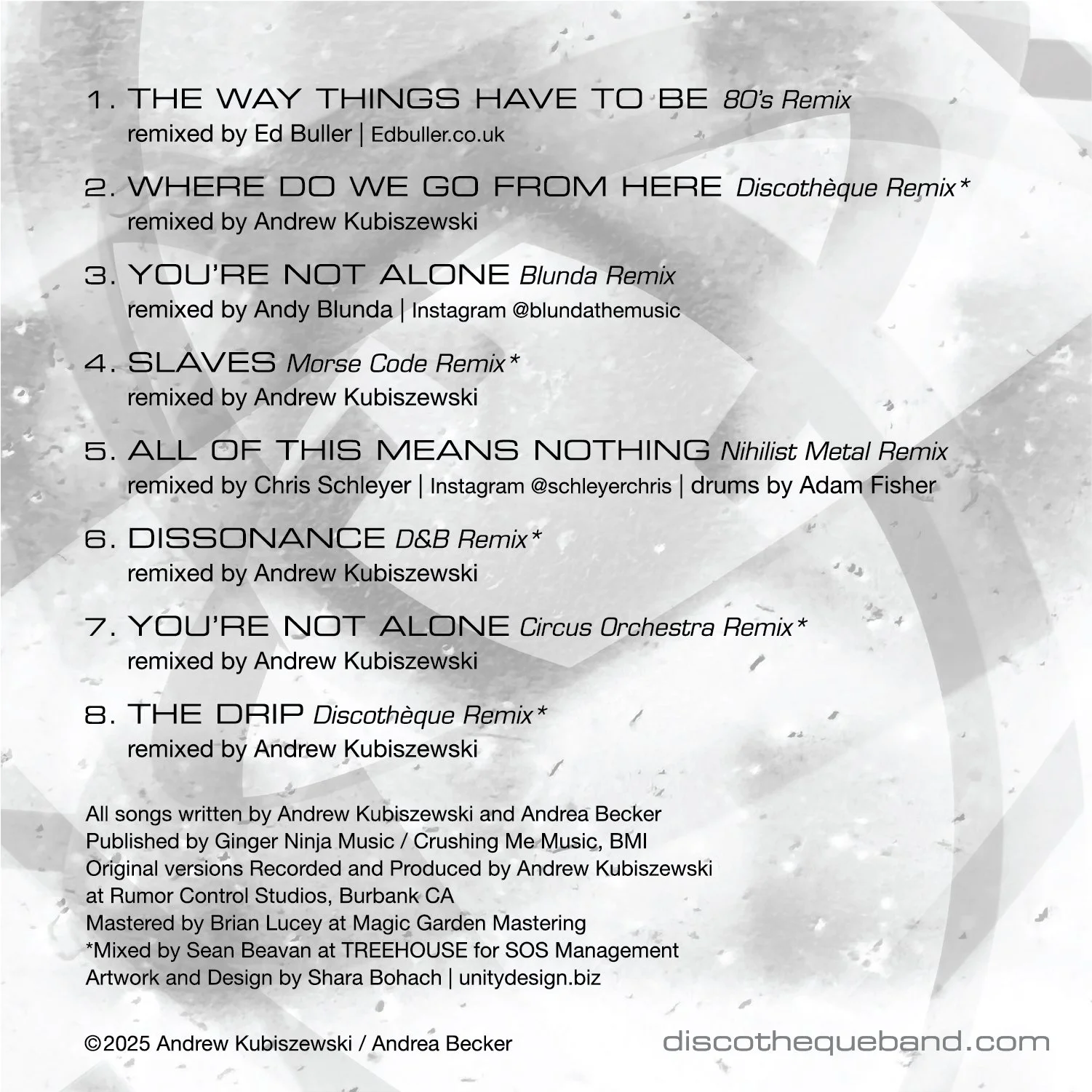Discothèque's 2nd remix collection, with remixes by Andy Blunda (Blunda the Music, Fastball, Paloalto, Jason Falkner), Chris Schleyer (Prick, Zeromancer, Kidney Thieves, Lucky Pierre), Ed Buller (Psychedelic Furs, Slowdive, Suede, White Lies, NODE), and Discothèque’s Andrew Kubiszewski.